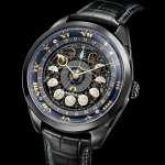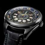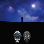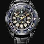 一方の「月齢盤モデル AA7804-10F」は、地球に最も近く、古くから人々に親しまれてきた天体・月をテーマにしたモデルです。独立して回転する24時間盤と月齢盤が連動し、月の満ち欠けや月と太陽の位置を、正確かつ詩的に映し出します。