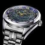 針やインデックス、12時位置のロゴマークにはゴールドをあしらい、特別モデルならではの華やかさを演出。精密に描かれた星空は、まるで腕元にプラネタリウムを載せているかのような、荘厳な美しさを湛えています。