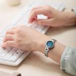一方のウィメンズモデル「ES9470-68W」(17万6000円)では、アワーマーカーとして配置された5ポイントのダイヤモンド、優美な曲線を描いたリーフ針、花をモチーフにしたブレスレットなど、フェミニンなディテールが随所に光る1本。奥行きを感じさせるグリーンのグラデーションが、手元に個性をプラスします。