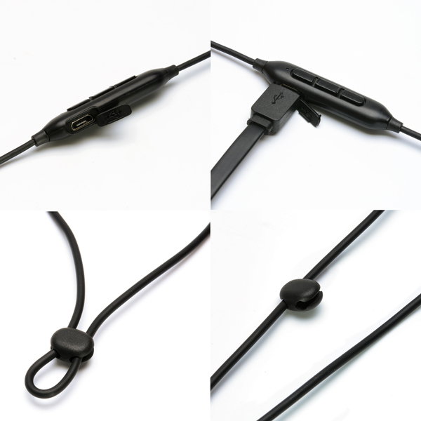 交換用のイヤーチップがS/M/Lの3種類(うちひとつは本体に装着)と充電用のmicroUSBケーブルが同梱。バッテリーは最大約8時間の連続再生が可能で、約2時間でフル充電できます。