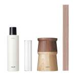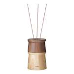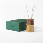 上下2つのパーツからなる、ウォルナットとオークの2樹種を用いた木製パーツは、切り株から樹木が香り立つさまをイメージしたもの。カリモク家具とのコラボレーションによって、家具製造過程で発生する端材をアップサイクルしてつくられた、サステナブルなディフューザーとなっています。
