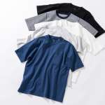 「スーツ屋の仕立てたTシャツ」(4389円〜)は、一見普通のTシャツのようで、スーツに合わせて着るための工夫が満載。新たに使用しているダブルジャージ素材は、洗濯後に縮んだり襟元がよれたりしにくく、ツルっとしたルックスで上品な印象です。
