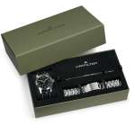 近年では38mm径モデルやホワイトダイヤルモデルなどさまざまなバリエーションを展開する人気作ですが、今回登場するのはアイコニックな42mm径モデルにレザーストラップとステンレススチールブレスレット、それに交換用の専用ツールを特製ボックスに収めています。