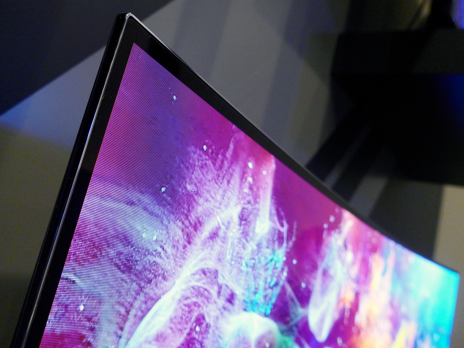 さらに「EG9600」で特筆すべきは、曲面のディスプレイを採用している点。発表会では画質の良さを強調していたが、ディスプレイが曲がっているから、見た目のインパクトもデカい。画面から5mほど離れて映像を見ると、一般的なTVと比べてもさほど違いを感じないが、さらに画面に近づくと、湾曲した画面に視界の左右が包まれているように感じてくる。この距離で2時間ほどの映画を違和感なく見続けられるかどうかは別として、視聴者をコンテンツへと没入しやすくする工夫としては、面白い試みだと感じた。