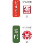 「歌舞伎柄」の本体には歌舞伎役者の隈取があしらわれ、印面には紫色の「あっぱれ」の文字が刻まれています。「雷門」は、本体に浅草寺の雷門の文字をあしらっており、印面も浅草寺の雷門の様子を再現しています。インキは赤です。「お寿司」の本体部分は、寿司屋によくある、さまざまな魚の漢字をまとめた湯呑を彷彿とさせるデザイン。印面では代表的な寿司ネタのマグロを赤インキで再現しています。