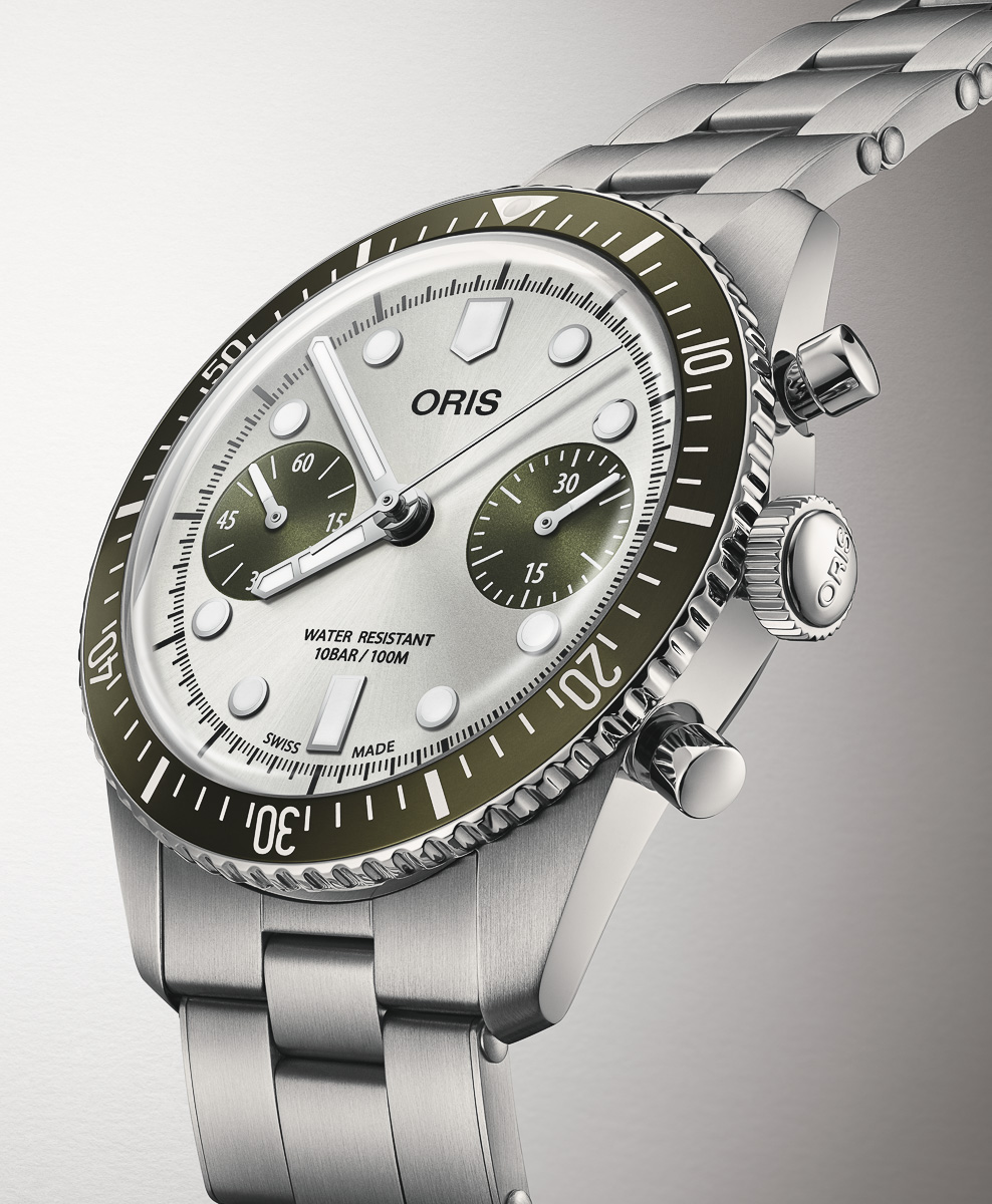 そんな「ダイバーズ65」に、今シーズンはスタイリッシュなカラーをまとったクロノグラフが仲間入り。シルバーグレー×オークグリーンのコントラストが鮮やかな「ダイバーズ65 クロノグラフ」(ブレスレット 71万5000円・レザーストラップ 68万900円)をご紹介します。