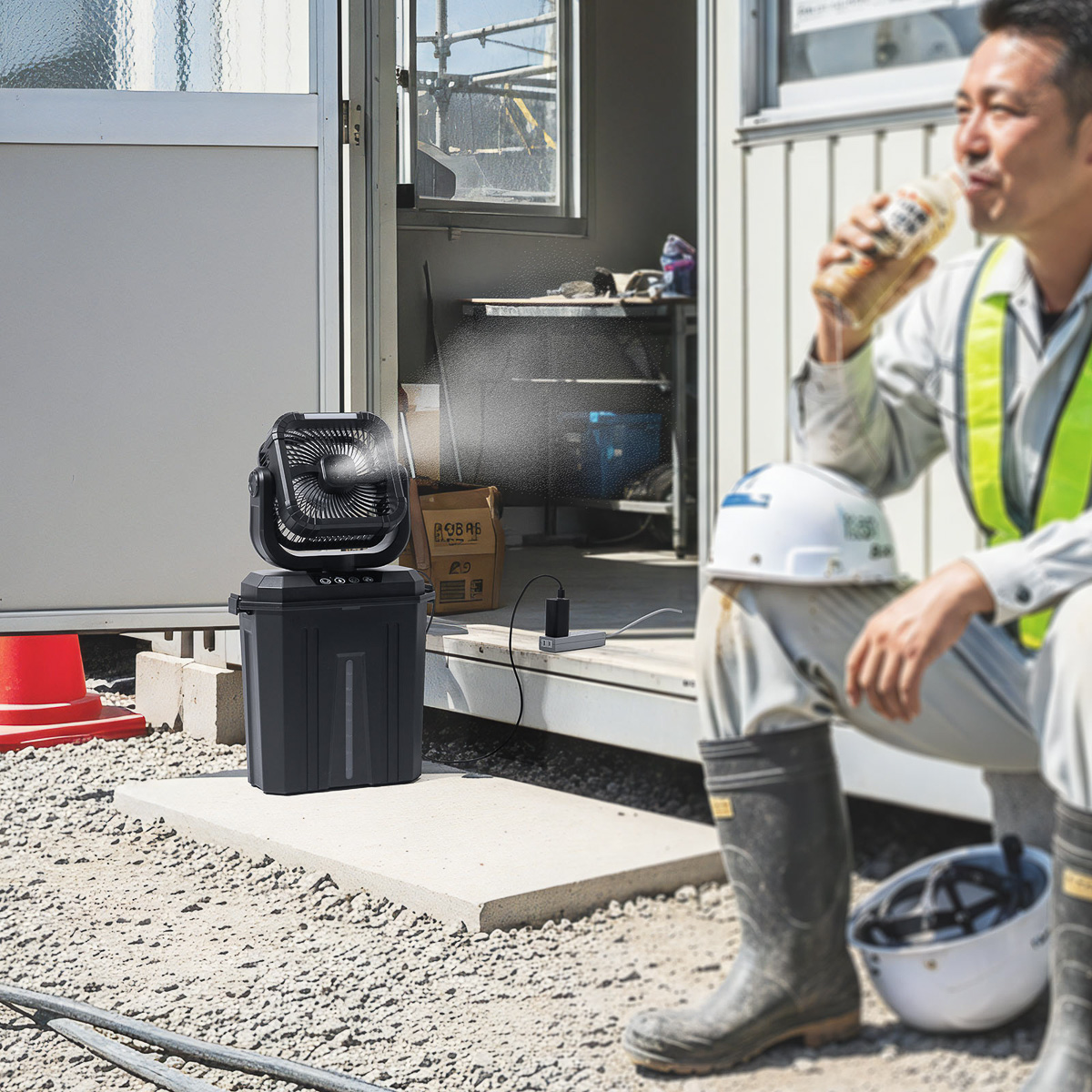本体は最大9時間連続で使用できる20000mAhのバッテリーを搭載したコードレス仕様。工事現場などの電源が確保できない場所はもちろん、キャンプやイベントなどあらゆるシーンで活躍するはず。