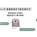 ヘアオイルには、「トステア」や「エルカラクトン」、「アルガンオイル」などの植物由来成分を配合し、髪にうるおいとまとまりを与えます。