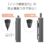 ノック時にはクリップが同時に本体へ収納される構造で、ペン先が出たまま手帳や胸ポケットに挟むことができない仕組みになっています。このため、ノック解除を忘れてインクで手帳や衣類を汚す心配がありません。もちろん、ノックを解除すればクリップは再び本体から出てくるため、手帳や胸ポケットに挟んで持ち運ぶことも可能です。
