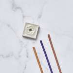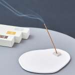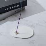 清楚な白い磁器で作られたフラワーモチーフのお香立てが付属しており、手持ちの耐熱皿に乗せればすぐに使用できます。コンパクトなパッケージで、ちょっとしたギフトにもぴったりです。