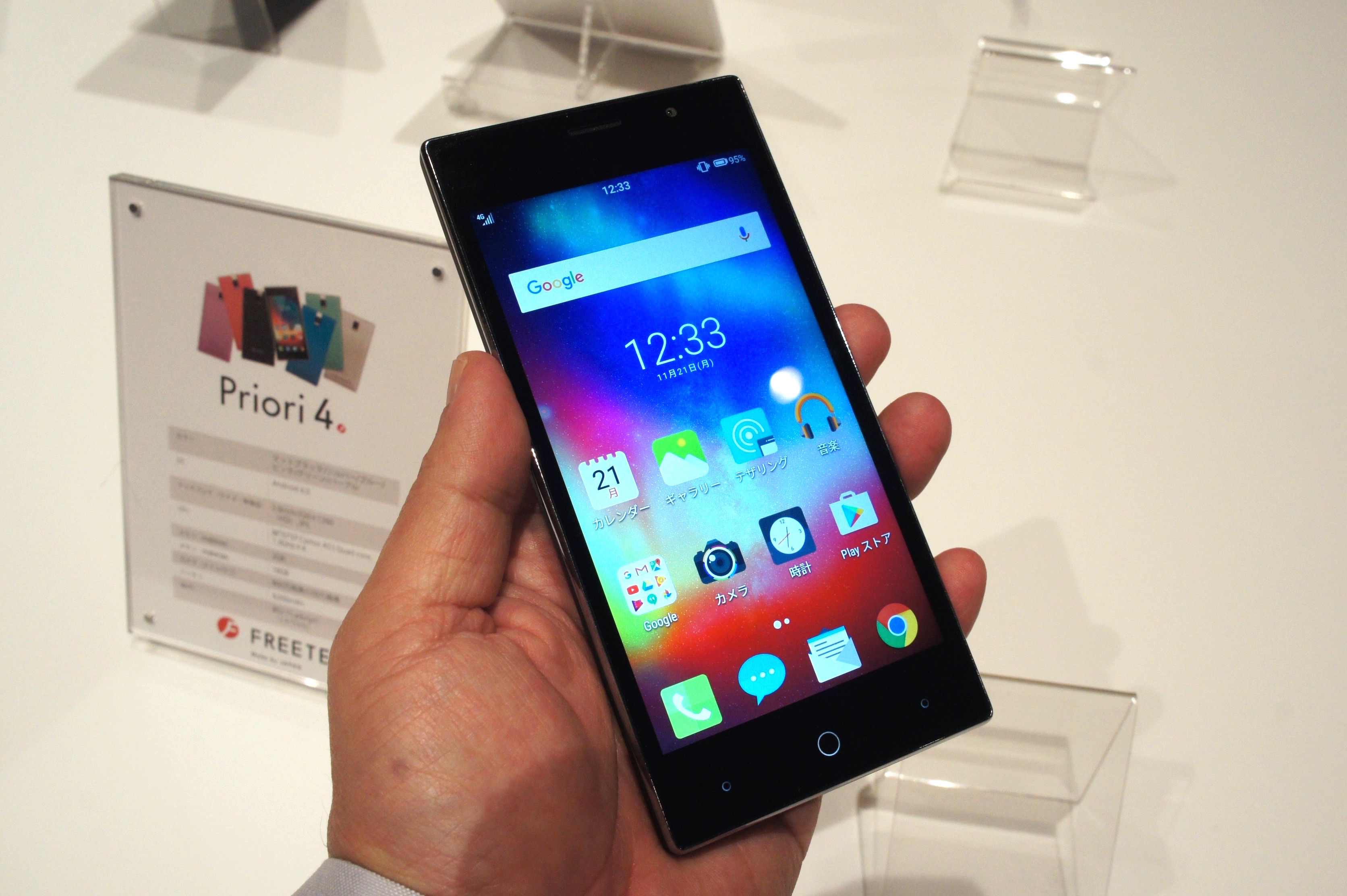 今回新たに発表されたのは「Priori 4」。5インチのHDディスプレイを搭載するエントリーモデルで、CPUは1.3GHz×4コア、RAM(メモリ)は2GBという構成。最大のセールスポイントは、6色の背面カバーを同梱すること。気分によってカバーを付け替えられて、万一キズをつけても新しいカバーに交換できるので、長く使いたい人には◎。価格は1万4800円(税抜)で、来年1月27日から発売されます。