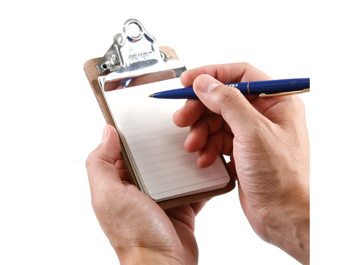 会社で上司の指示を聞きとる時、メモを取りながら電話をする時、ペンを走らせたらメモがズレたり、めくったメモが手にかかって書きにくかったり…そんな時に便利なのがメモをガッチリとつかんでくれるクリップボード。よくあるA4サイズ大でなく、ミニタイプが意外に便利なんです!