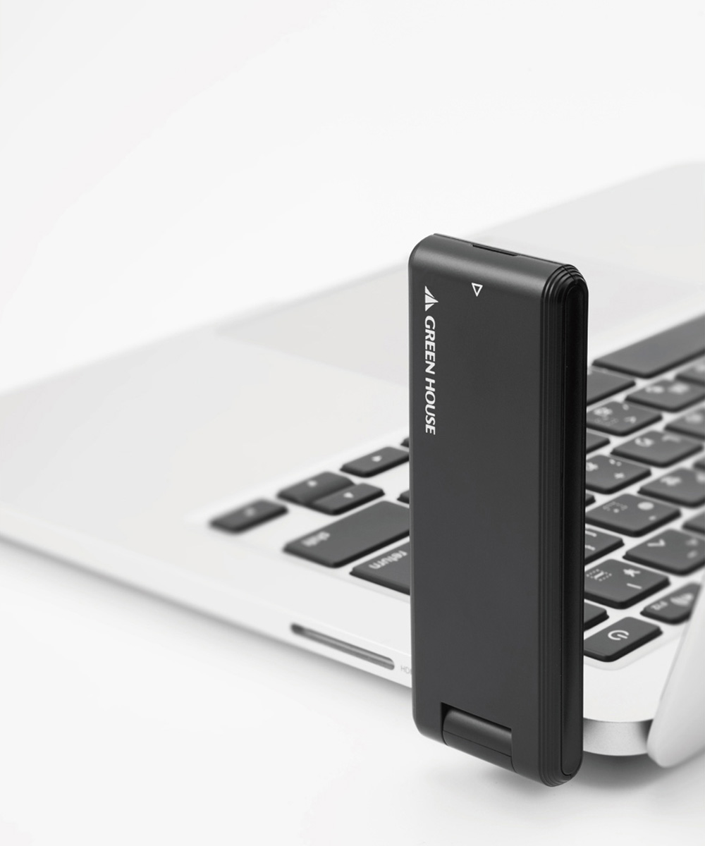 「GH-UDG-MCLTEC」は、パソコンのUSBポートに接続してLTE回線にアクセスするLTE USBドングル。バッテリーレスでUSB端子も収納できるコンパクトな製品のため、持ち運びが簡単で、パソコンと一緒に持ち運んでも邪魔になりません。