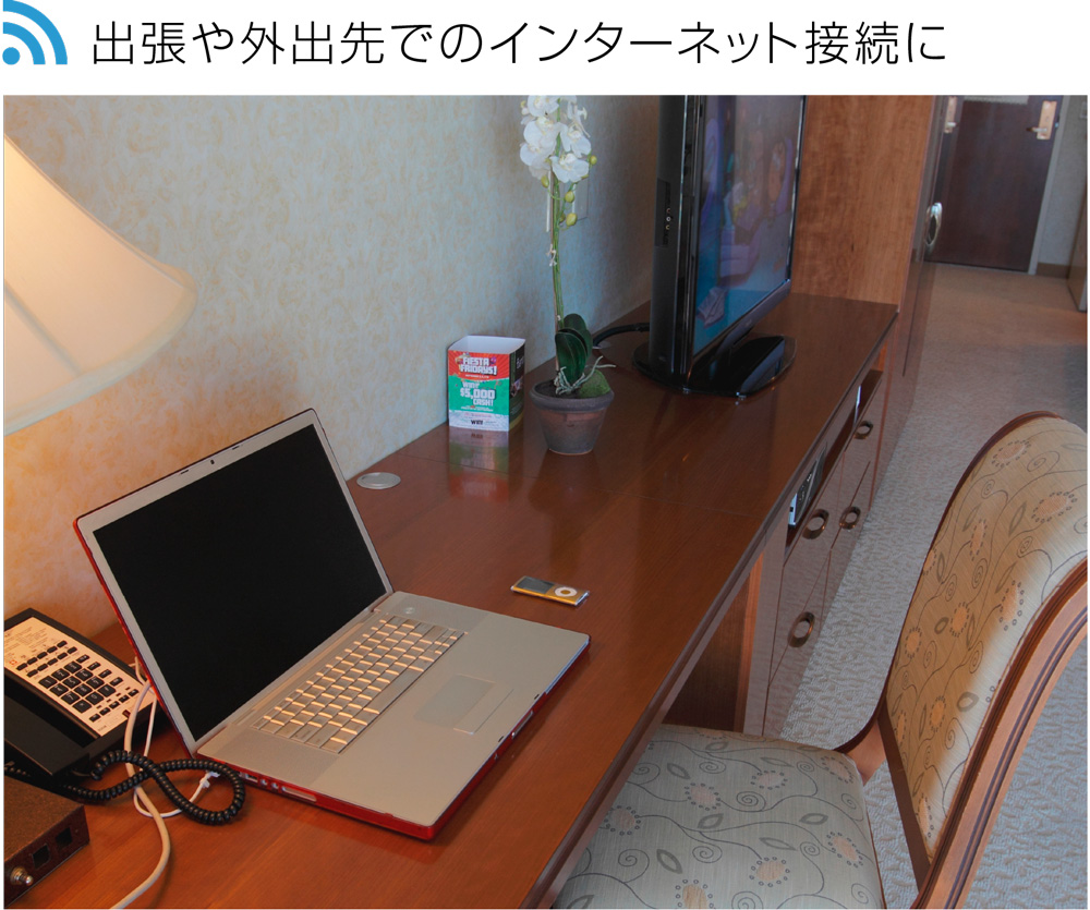 使い方はいろいろ。出張先や外出先でのインターネット接続はもちろん、屋外でPOS端末をネットワークに接続したり、WEBカメラを直接インターネットに接続、デジタルサイネージデータの受信など、幅広く活用できます。