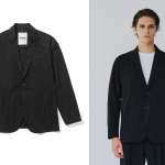 一見すると“ブラックデニム”風ながら、ポリエステル100%素材を採用したセットアップも新登場。「エッセンシャル テックデニムジャケット」(3万8500円)と「デニム ワイドテーパードパンツ」(2万6400円)をラインナップしています。