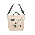 フロント中央には大胆なロゴを、バックには“FOR HERE OR TO GO(店内利用またはお持ち帰り)”というフレーズを配した、遊び心あるバッグです。カラーはホワイトとブラウンの2色展開。