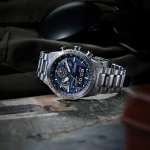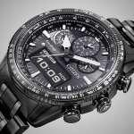 またベゼル部には掛け算や割り算、速度・距離計測など、さまざまな計算に使える航空計算尺を装備。他に最大99分59秒まで設定できるタイマーや1/100秒クロノグラフ、パーペチュアルカレンダーなど実用的な各種機能も搭載。パワーセーブ作動時でフル充電の状態から約3年稼働できるというスタミナぶりも頼もしい。