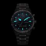 機能面にも目を向けておきましょう。パイロットウオッチに必須のワールドタイム機能は、世界43都市+世界協定時(UTC)に対応、簡単な操作で時刻の入れ替えを即座に実行することが可能。デジタル部とアナログ部とで、異なるふたつのエリアの時刻を表示させることも可能です。