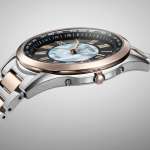 ケースサイズは38mm径×厚さ8.5mm、重さは約62gと、軽量・薄厚・コンパクトな設計です。ライトシルバーとサクラ色のツートンカラーは、質感を損なうことなく硬度化を実現する独自技術・デュラテクトプラチナ&デュラテクトサクラピンクによるもので、ミラー仕上げにしたバンドの中ゴマとともにウォッチ全体に特別感を演出します。