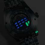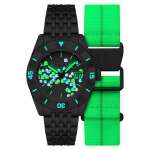 中ゴマに細かな楕円状パーツを使ったステンレススチールの“ライスブレスレット”を採用し、時計自体はビジネスでも違和感がないエレガントな印象に。ファントムたちと一緒に暗闇で浮かび上がる交換用の蓄光ナイロンブレスレットも同梱されており、工具ナシで簡単に付け替えることが可能です。