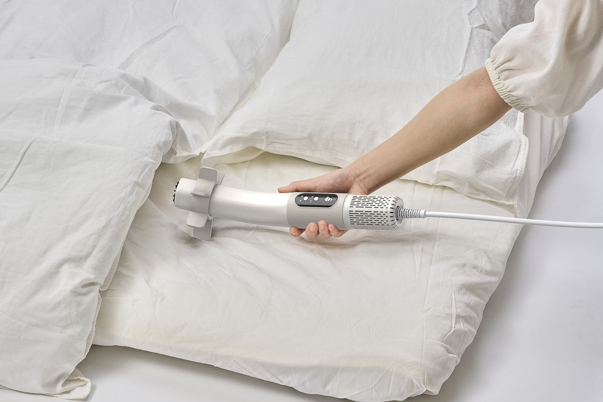 11月中旬発売の「ふとんジェット R500」は、“ふとん乾燥機”と“ふとんウォーマー”を兼ねた2WAY仕様のアイテム。乾燥機に加え“温活”をサポートすべく開発された2024年発売の「ふとんジェットヘキサゴン」の意思を受け継いだリニューアルモデルです。本体形状を見直し角度をつけたことで、より効率的に掛布団と敷布団の間にジェット温風を送り込めるようになりました。