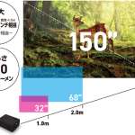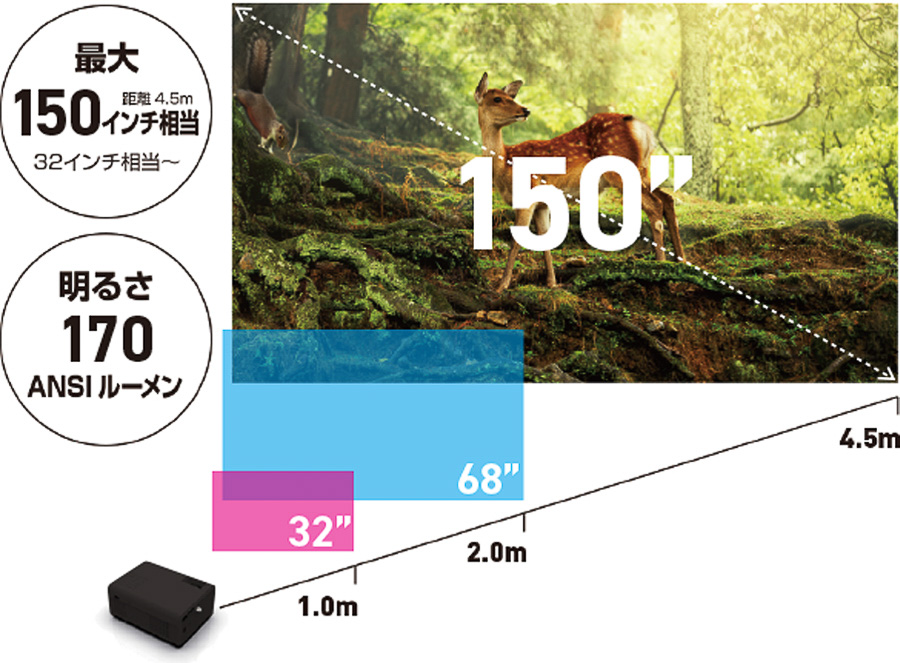 画面サイズは投影距離によって変化し、32インチ(投影距離1m)から最大150インチ(投影距離4.5m)相当まで調整可能。明るさは170ANSIルーメンのため、遮光して部屋を暗くする必要はありますが、解像度1920×1080のフルHDかつ、LCD技術による色鮮やかな映像を大画面で楽しめます。