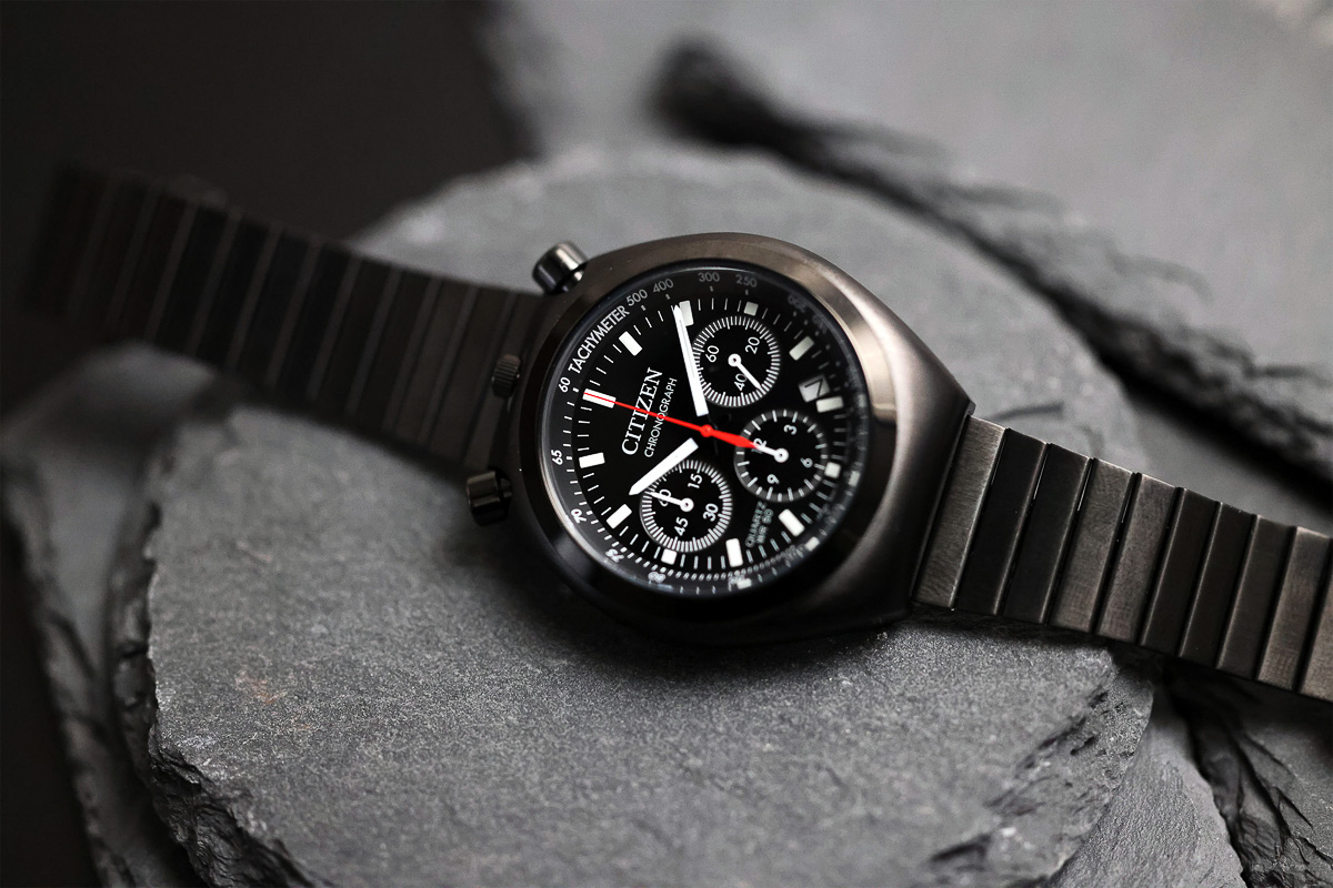 1973年にシチズン初の本格クロノグラフ機能を搭載した時計として誕生した「クロノグラフ チャレンジタイマー」。リューズとクロノグラフのプッシャーが、手首に干渉しないケース上部に配置され、“角”のように見えるユニークな姿から“ツノクロノ”の愛称で親しまれているアイコニックな時計で、“TSUNO CHRONO”として復刻モデルも複数登場しています。