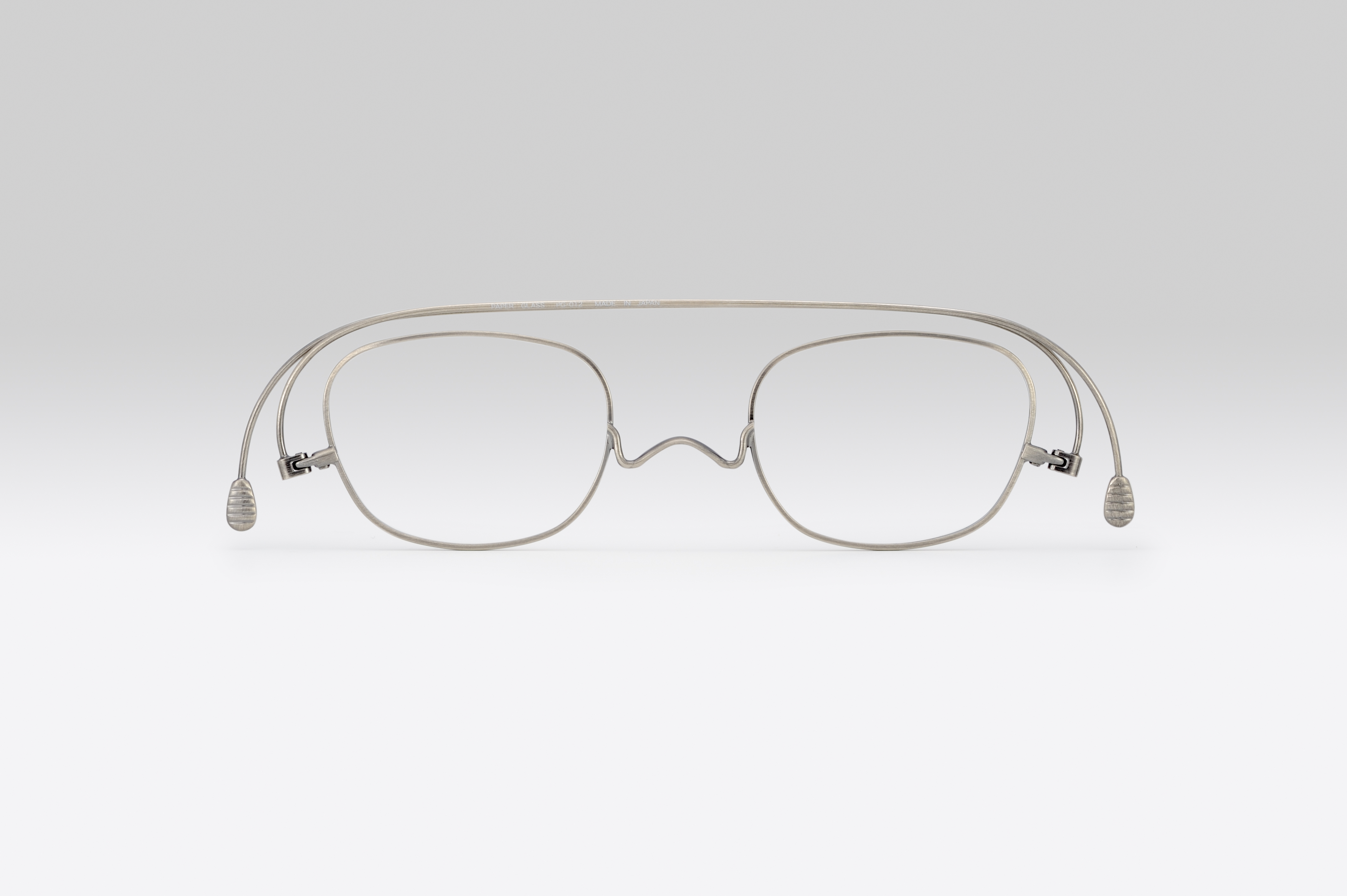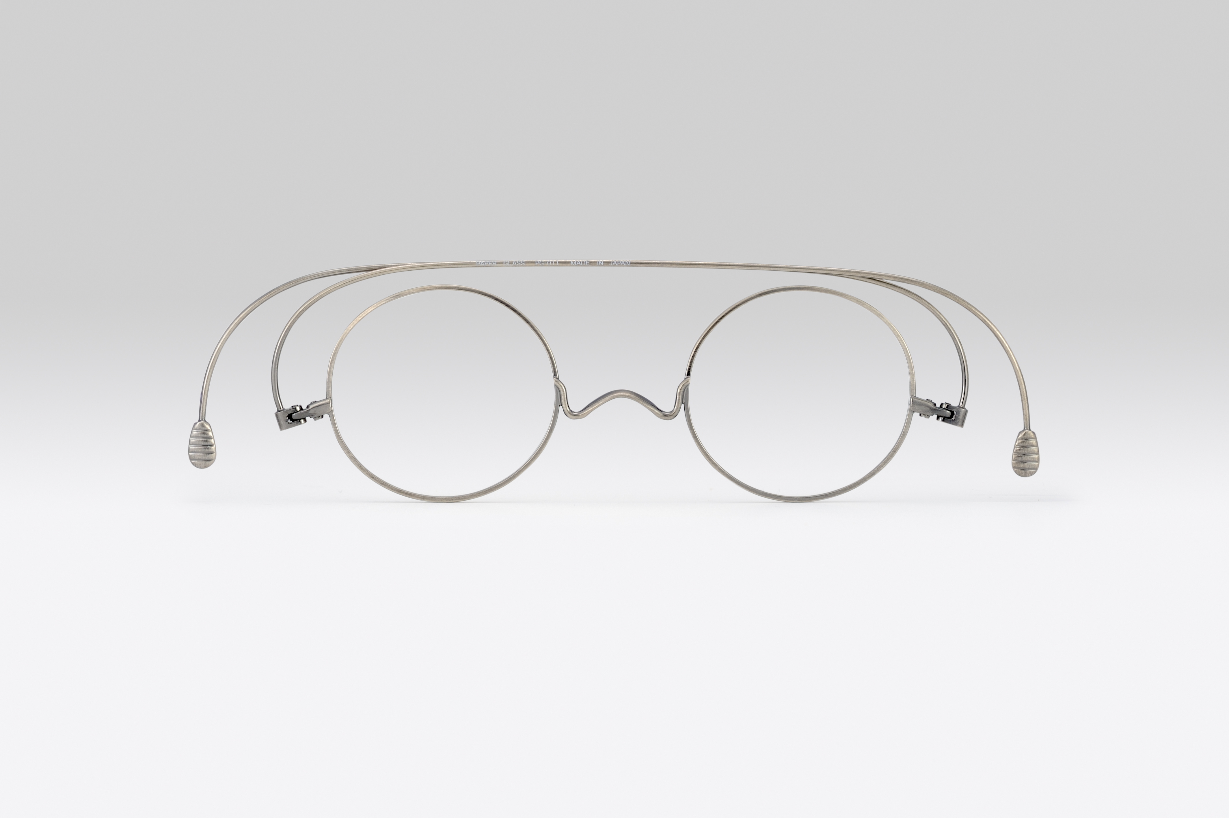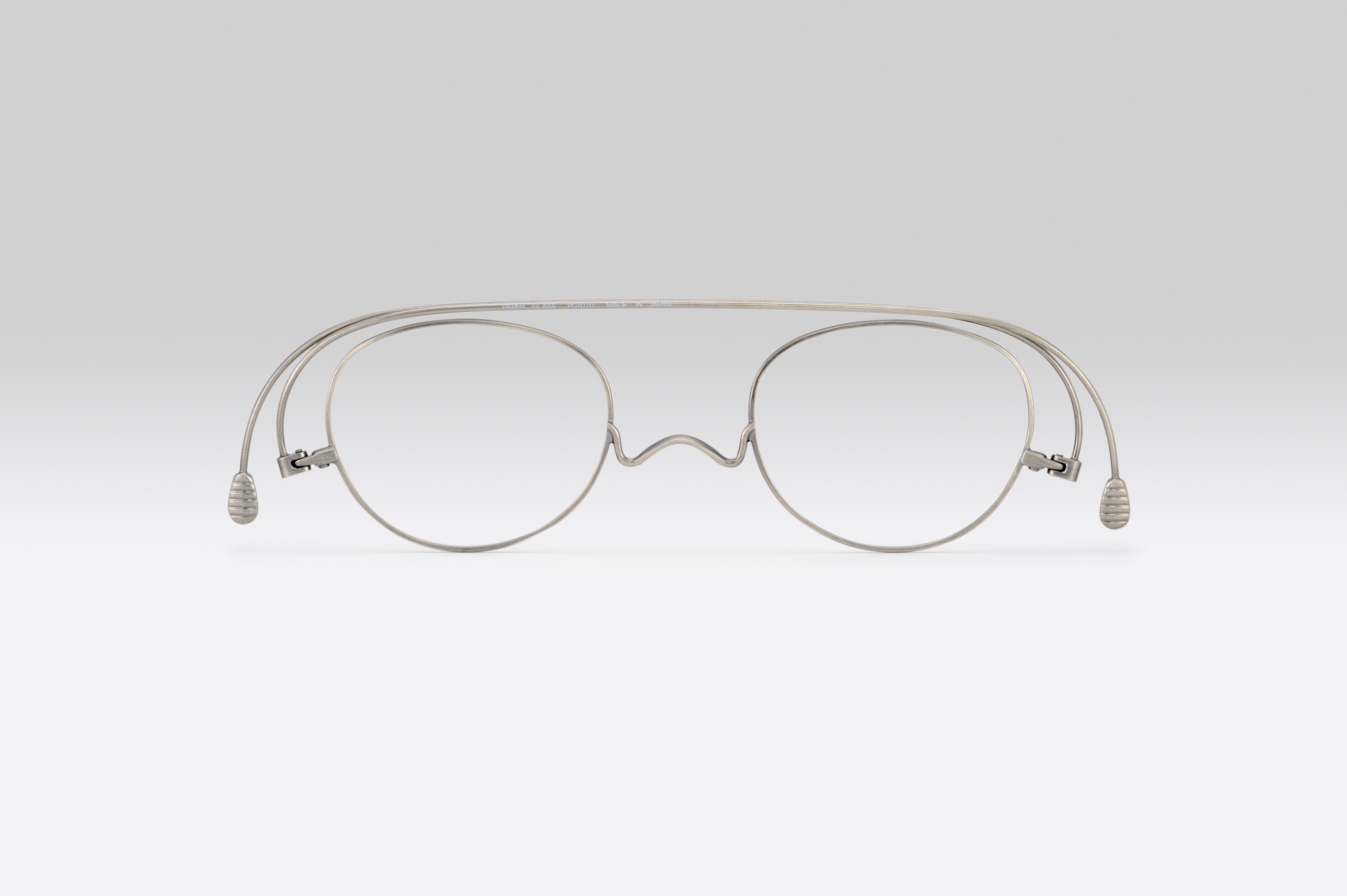 特徴的なのは、下から上へと伸びるテンプル(ツル)。閉じたときの重なりを限りなくゼロにするために編み出されたこの繊細なカーブを実現するために、素材にはステンレススチールを採用しています。