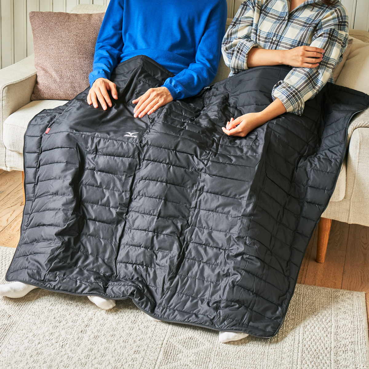 「ブレスサーモテックフィルウォーマー クルミーノ」(1万1000円)は、座ったり立ったりを繰り返す時間が多い人に合いそうです。ひざ掛けとして使った状態から、端のファスナーを閉じて腰巻きにしたり、肩から羽織ったりと形を切り替えられます。