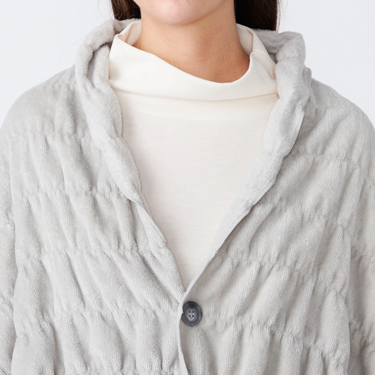 特徴的なのは、見た目のやわらかさに反してよく伸びる生地で、姿勢を変えたときや腕を伸ばしたときにも突っ張りにくく、体の動きに自然に付いてきてくれそうなところです。