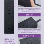 また、電源タップには大気中や電線を伝って家の中に入ってくる高電圧の電気(雷サージ)を防ぐ雷ガードやトラッキング火災の原因にもなるホコリの蓄積を防ぐホコリシャッターを搭載。電源を一括でオン・オフできる電源一括スイッチも付いているので旅行やお出かけの際にまとめて電源をオフにでき、待機電力の節約にも繋がります。