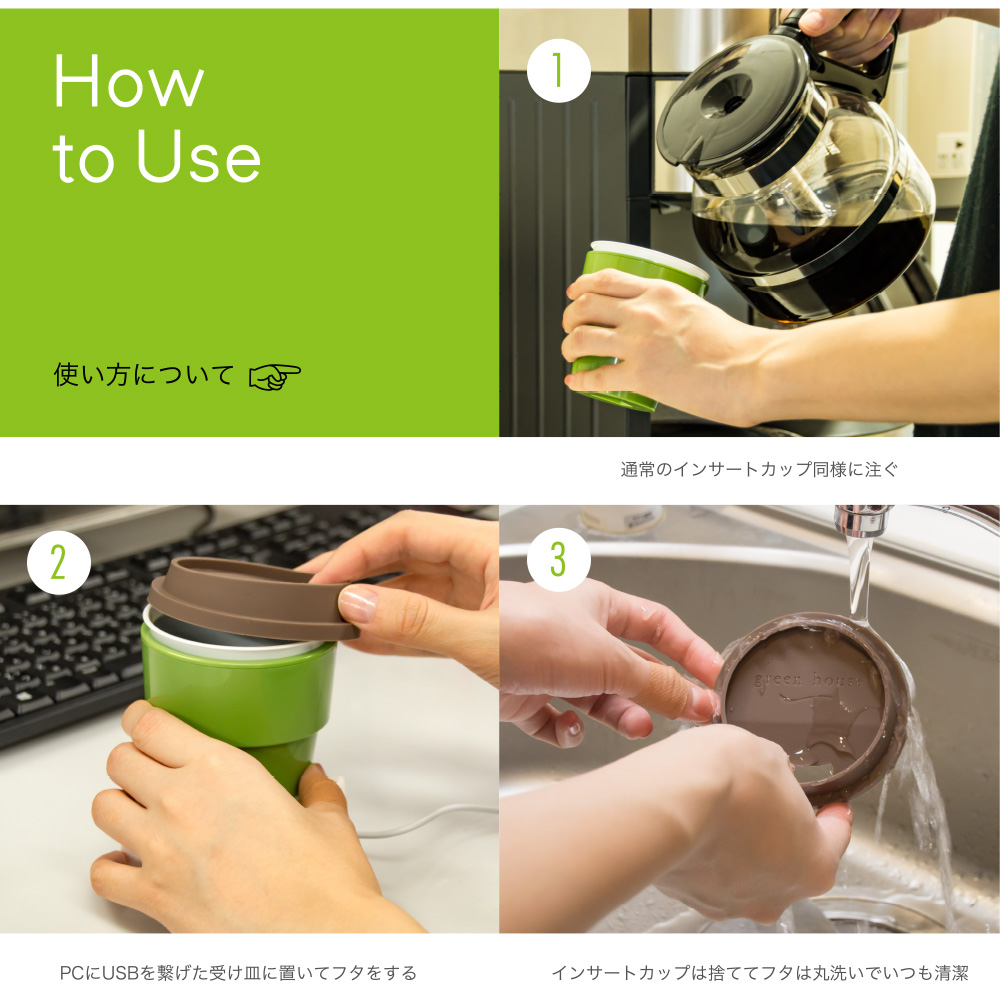 使い方はカンタン。本体にインサートカップを入れてシリコンキャップのフタを装着。あとはスタンドにセットしておけば、自動で50℃~60℃の飲み頃温度をキープしてくれます。