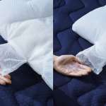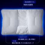 また、形状に合わせて内部には役割ごとに配置された3タイプの素材を使用。後頭部があたる部分には、へたりにくく通気性と耐久性を誇る独自素材“高反発網状素材リフル”を。そして、もちもちと柔らかで弾力性に富んだ“エラストマーパイプ”を首元に使うことで頭と首への圧迫を軽減。さらに高通気で弾力性を保持する“ソフトパイプ”をサイドに配置し、あおむけ時の安定感に、横向き寝でも枕が沈みにくくし理想の寝姿勢にいざないます。