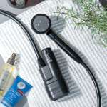 車のボディなどに装着可能な吸盤型と木などに吊るせるポール型の2種のホルダーを装備。場所を選ばず使えます。なお、バッテリー側のディスプレイには残量を1%単位で表示とシャワーの途中で急に止まる不安も気にせずに済みます。