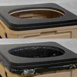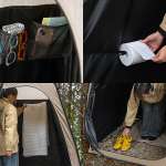 室内には本体一体型のフロアシートを完備。タオルや衣類を掛けられるベルトにメッシュタイプのポケットも。また、トイレットペーパー専用ベルトと使い勝手を考え抜いた装備となっています。