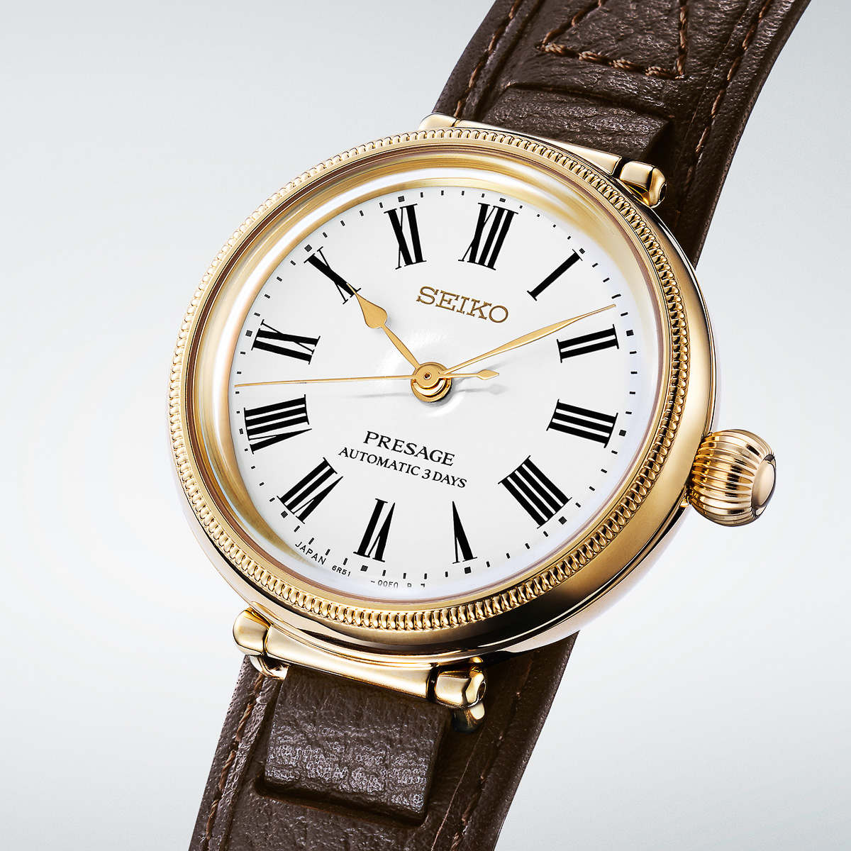 奥行きを感じさせるグレーのグラデーションダイヤルは精工舎の設立前に服部金太郎のアイデアで輸入懐中時計にあしらわれていた美しい彫刻から着想を得て、型打文様が施されています。緻密な文様のグラデーションダイヤルに映えるインデックスや針のゴールドも印象的です。