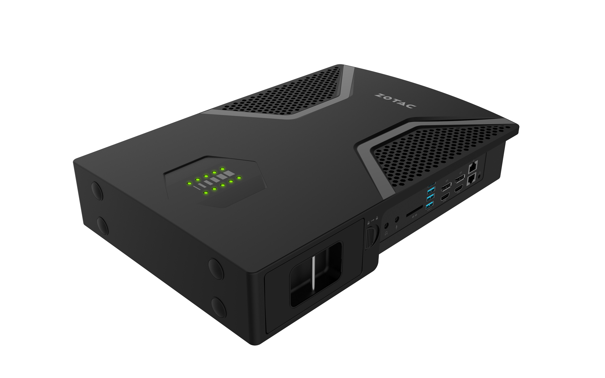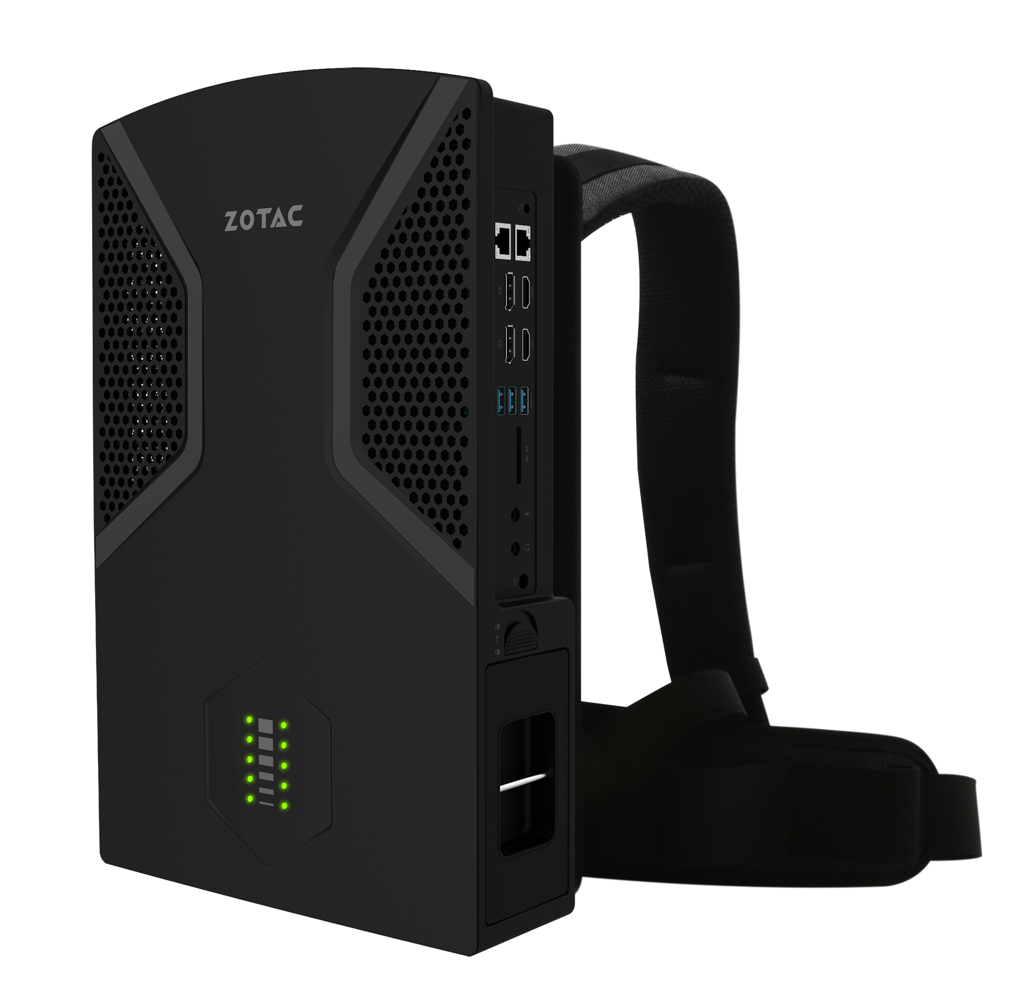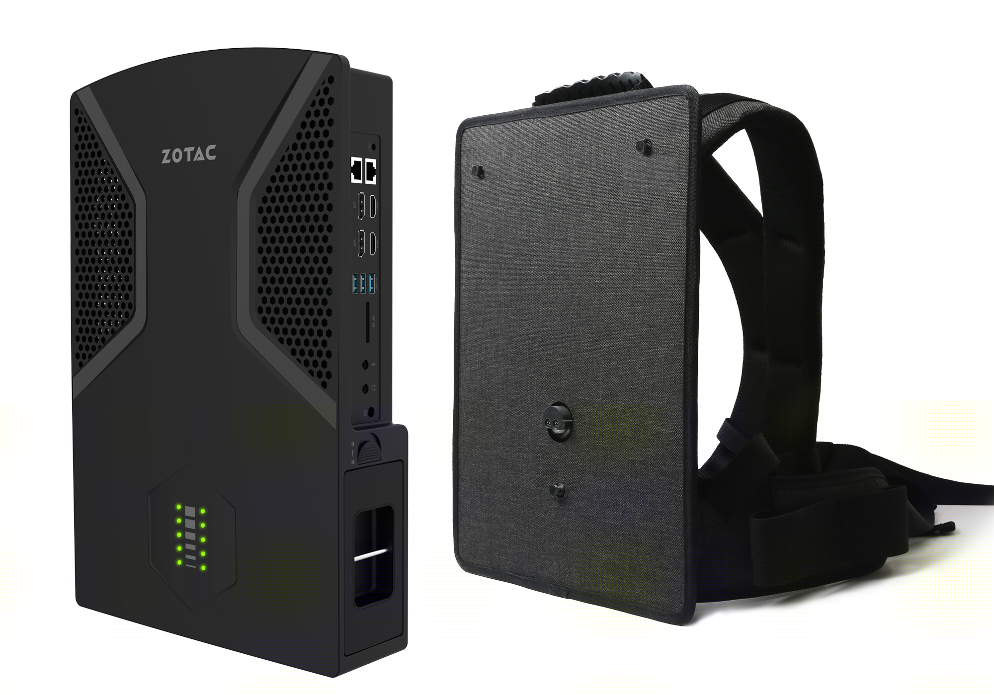 体と一体化し、ヘッドマウントディスプレイとのケーブル配線を気にせずに使用できる、アスクから発売されるバックパック型PC「ZOTAC VR GO」は、製品自体もゲームに登場しそうなぐらいクールなデザイン。