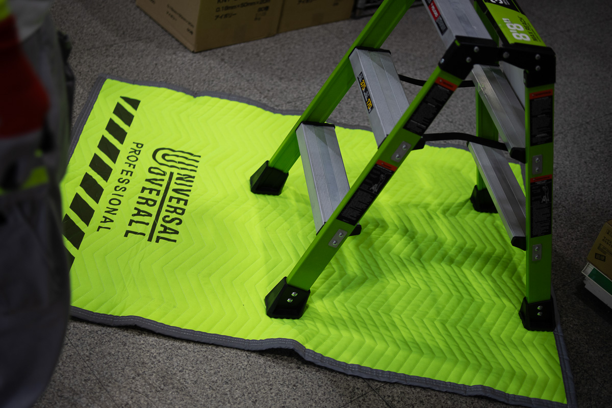 引っ越しや運搬作業の際に、傷つけたくないアイテムや場所などを保護するための“養生マット”。作業現場における縁の下の力持ち的な地味なアイテムですが、それをド派手な蛍光色でカラーリングしたのが、シカゴの老舗ワークブランド・UNIVERSAL OVERALL(ユニバーサル オーバーオール)が日本で展開しているプロフェッショナルラインのUNIVERSAL OVERALL PROFESSIONAL(通称UO PRO)です。