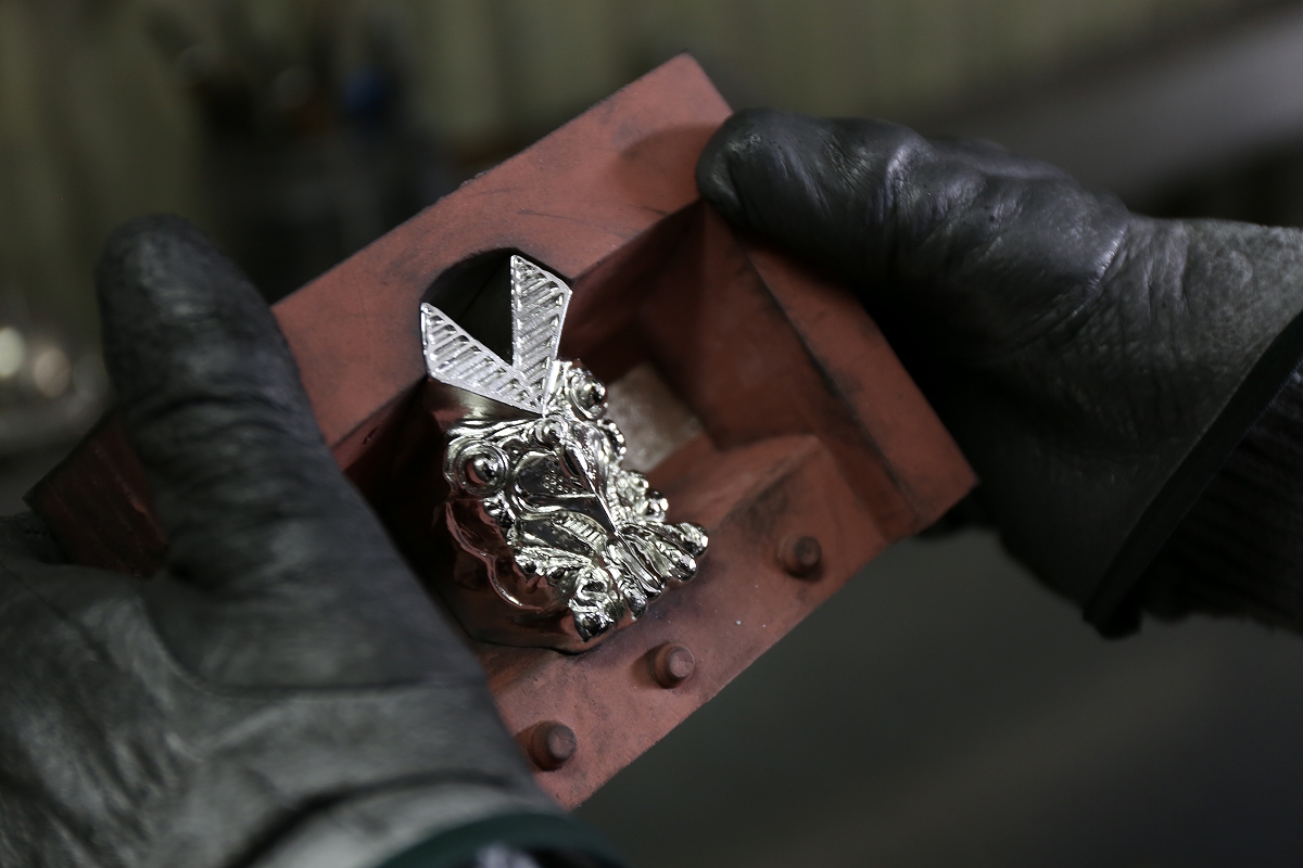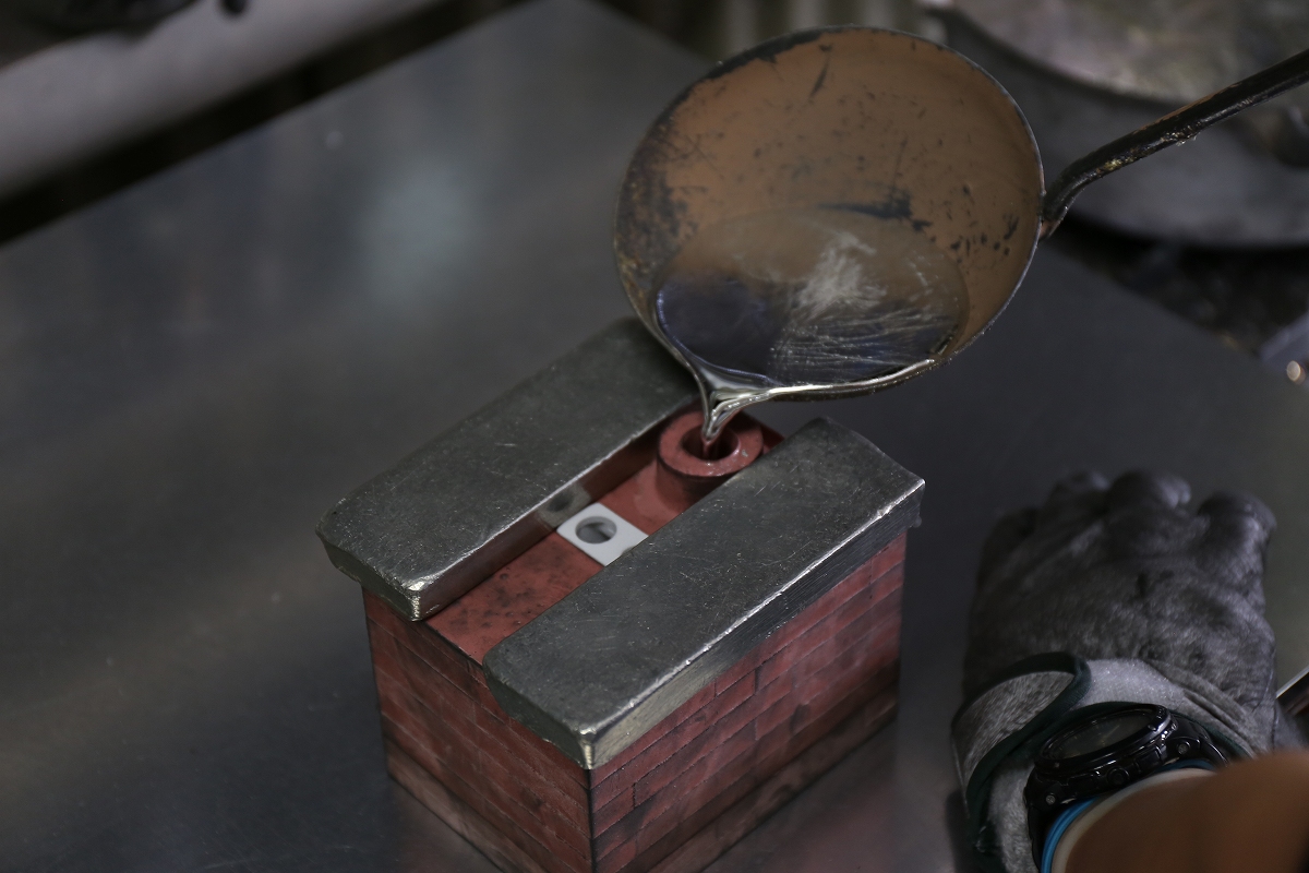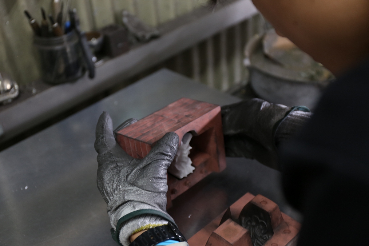 鋳型の中に約260℃まで熱した錫を流し込み、冷え固まった後に取り外したそれを職人が熟練の技でひとつひとつ研磨している。各工程は手作業のため、商品に微妙な個体差が生まれるのはご愛敬。