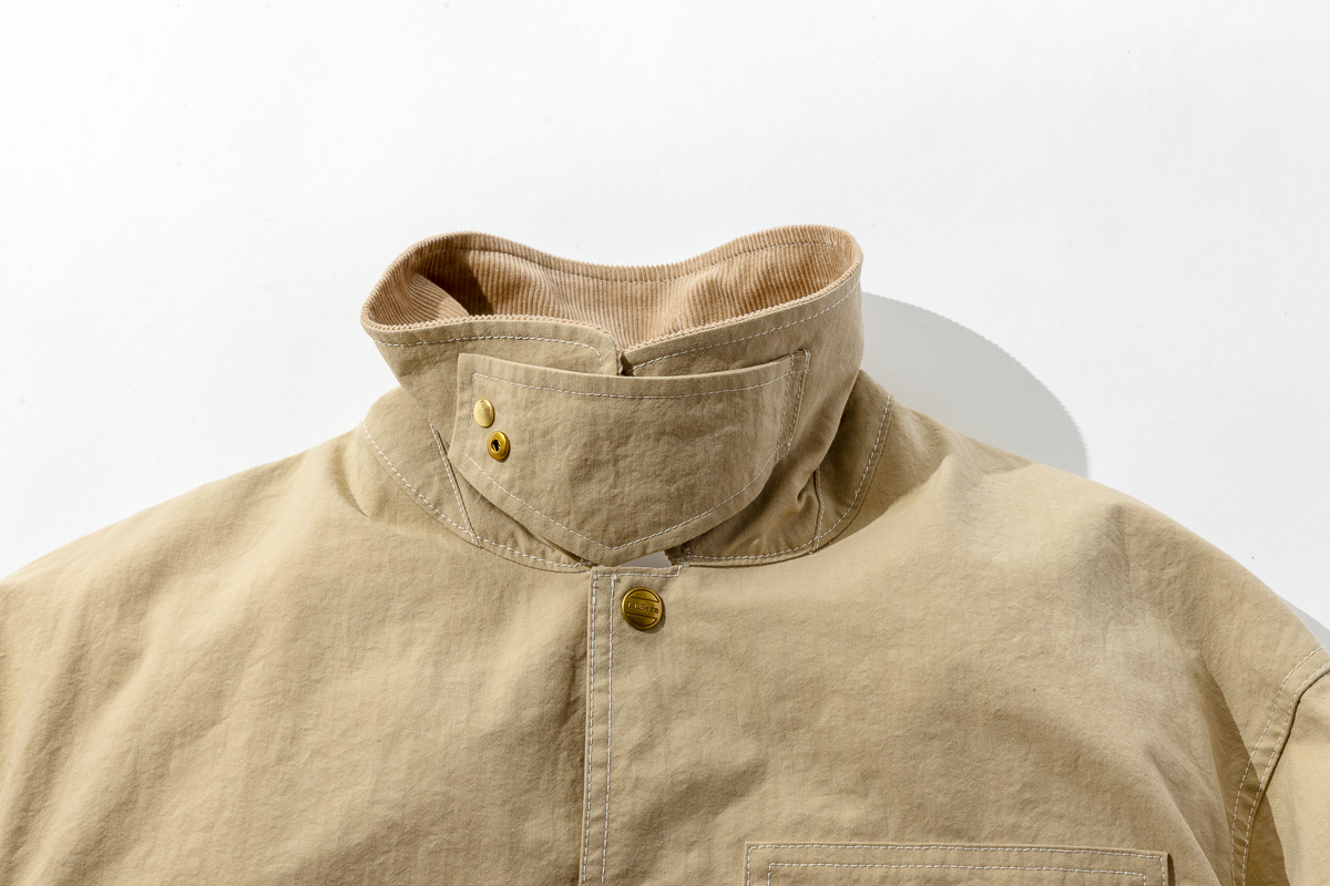 「オリジナル・フィールド・コート」を再構築し、高温多湿な日本向けに軽量化を実現。なお、生地に東レ開発のCEBONNER(セボナー)ナイロン・キャンバス地を採用。シワ加工を施したマットでナチュラルな風合いが特徴です。襟部分は立ち襟仕様にもできるので着こなしの幅も広がります。