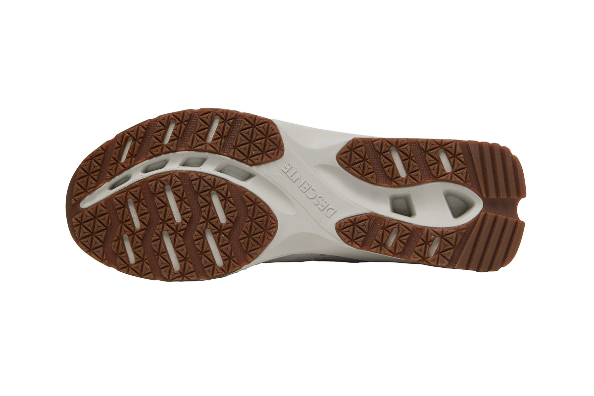 もちろん、アウトソールにもしっかりとパンチングを配置。と同時に軽量化にも貢献。無駄な部分は削ぎ落としつつ、グリップ力に摩擦力、さらに駆動力をキープするために、細かなラグを施したデザインとなっています。機能性だけでなく、視覚的にもユニークな印象に。全体的に厚底すぎないため、足元がすっきり見えるスリム&スタイリッシュなスタイリングが叶います。
