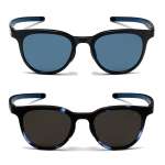 フレームカラーはブラック(3万8500円 ※両モデル共通)、べっ甲柄のマットブルーデミ(3万8500円)、クリア系グレー(4万700円)の3色で、それぞれレンズの種類が異なります。ブラックフレームはダークブルーの偏光レンズ、マットブルーデミはブラックの偏光レンズ、グレーは調光レンズを装着。