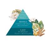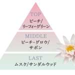 トップノートは、ピーチ/リーフィーグリーン、ミドルノートがピーチグロウ/サボン。ラストノートがムスク/サンダルウッドと時が進むにつれてより落ち着いた雰囲気となります。