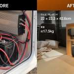 そうして実現したのが2000Whクラスとしては小型の22×22.3×42.6cm。立てても寝かせても使えるカタチなので、例えばスペースの制約が大きい車中泊時の車内などでは助かること間違いなし。ハンドルを引き上げるタイプではなく、本体に持ち手が付いているので、シンプルな直方体になっている点も設置のしやすさ動かしやすさにつながっています。ちなみに重さは17.5kgなので、同クラスとしては一般的ですね。