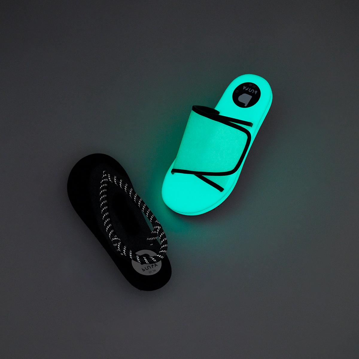今回ピックアップするのはbuntAの「buntA Slide glow」、そして「buntA waraji sandal glow」。この2足の何がユニークか、それはすでに写真でもおわかりかと思います。そう、暗所では光るんです。