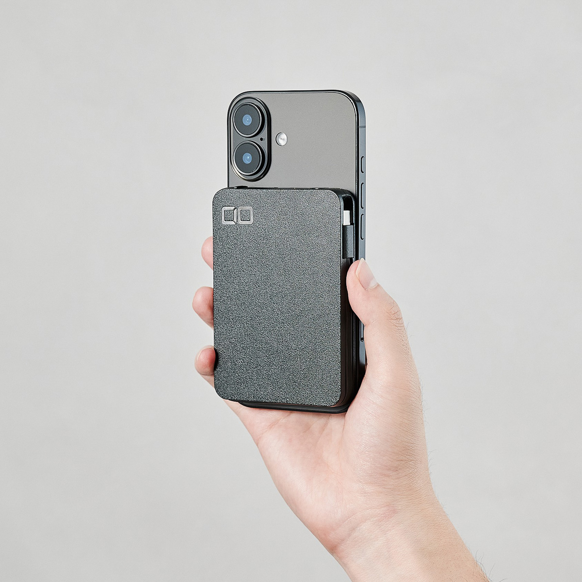コンパクトなボディと、1日分をしっかり充電できる容量の、バランスのよさが特徴のこのモデル。本体サイズは約100×70×14mmとスマホ幅よりスリムなので、MagSafeでスマホにくっつけて重ね持ちしても手に収まりやすく、充電しながらズボンのポケットに入れてもかさばりにくいサイズ感です。