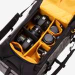 機材へのアクセスも、カメラバッグとしてはしっかり押さえられています。背面が大きく開く構造になっているため、ザックを下ろせば中身を一気に見渡せる仕様。上から手探りで取り出すようなストレスがなく、機材の出し入れや整理がしやすいのがポイント。