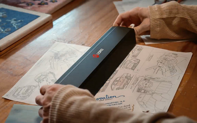 本体サイズ35.5×6.8×5.1cm(展開時は35.5×25.6×27.2cm)、重さ690g。携帯性に優れたボックス形状のスキャナーは折り畳み式になっていて、展開することでマットが一体となった自立タイプのスキャナーに早変わり! スキャンマットはマグネットで閉じられていて一瞬で展開が可能。使いたいときにだけパっと展開して、使わないときはサッと収納できるため省スペースでデスクの上に置きっぱなしでも邪魔になりません。