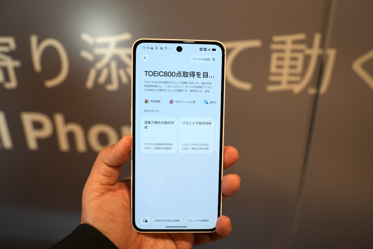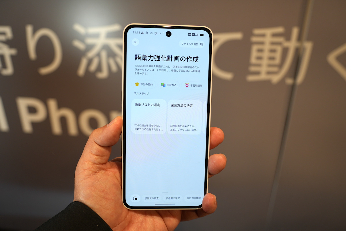 最初から調べたいことがある場合は、ブラウザを起動しなくても、ホーム画面をスワイプするとエージェント画面が表示されます。プロンプトを入力するか話しかけるだけで操作を開始できます。例えば、目的地を伝えると、旅行の計画を立ててくれたり、「TOEICで800点を取る」などの目標を設定すると、学習プランを作成してくれたりもします。