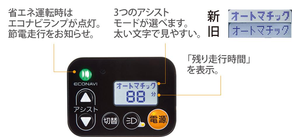 このほか走行条件からアシスト力を自動的にコントロール、節電しながら状況に適した運転ができる《エコナビ液晶スイッチ4S》を搭載。走行中のバッテリー残量からあとどれだけアシスト可能かを判断し、距離と時間で表示してくれるのも便利だ。